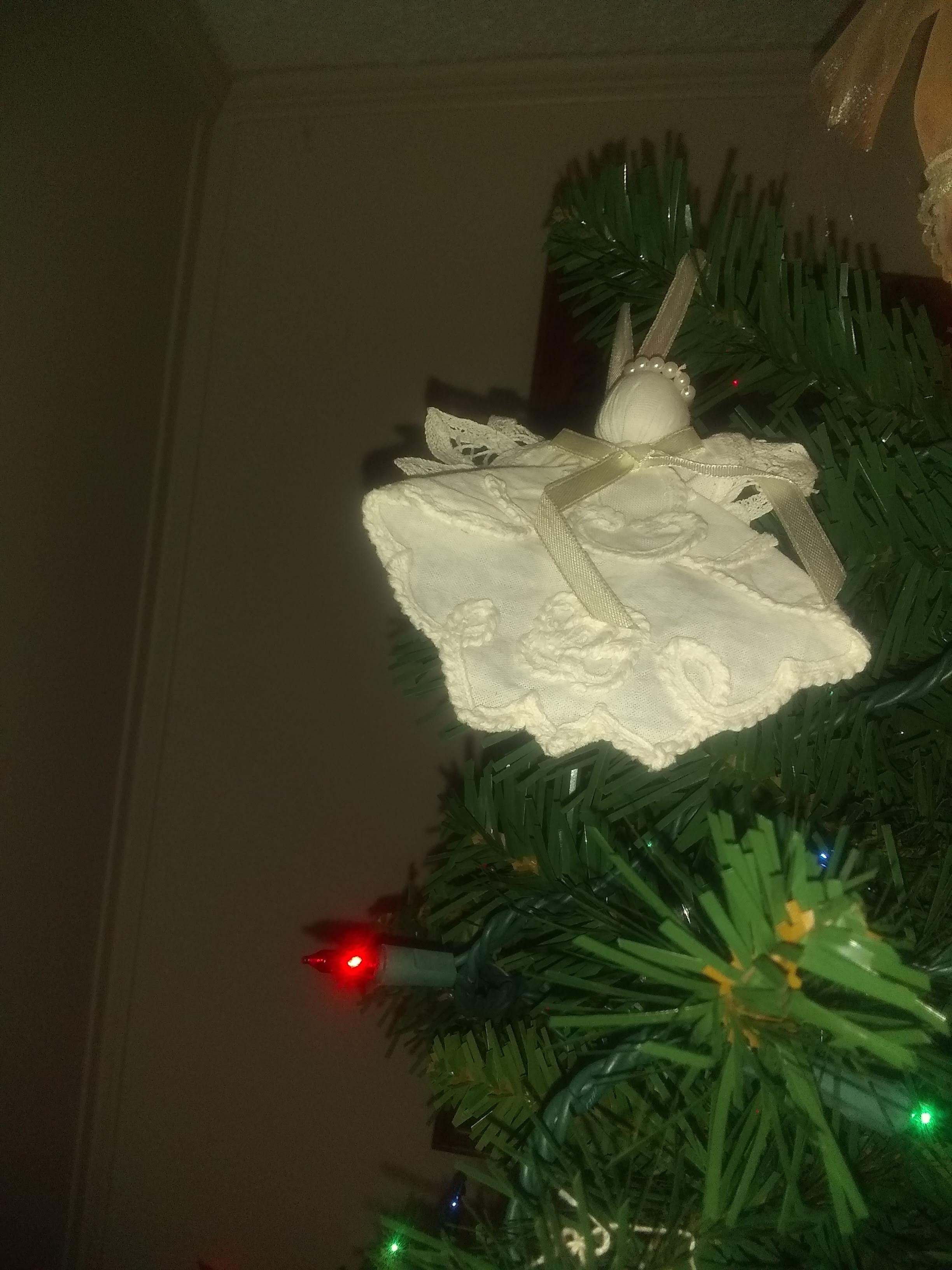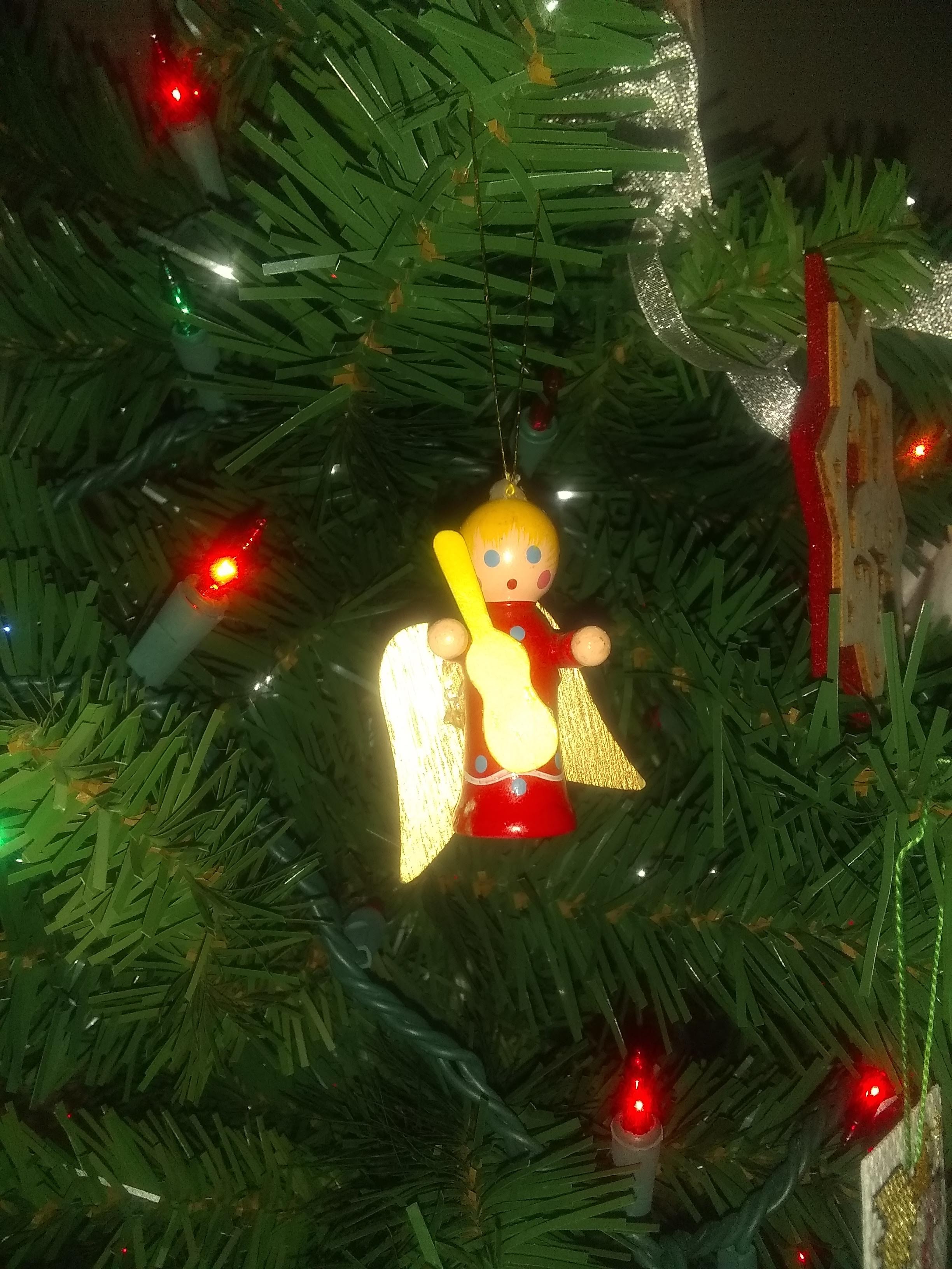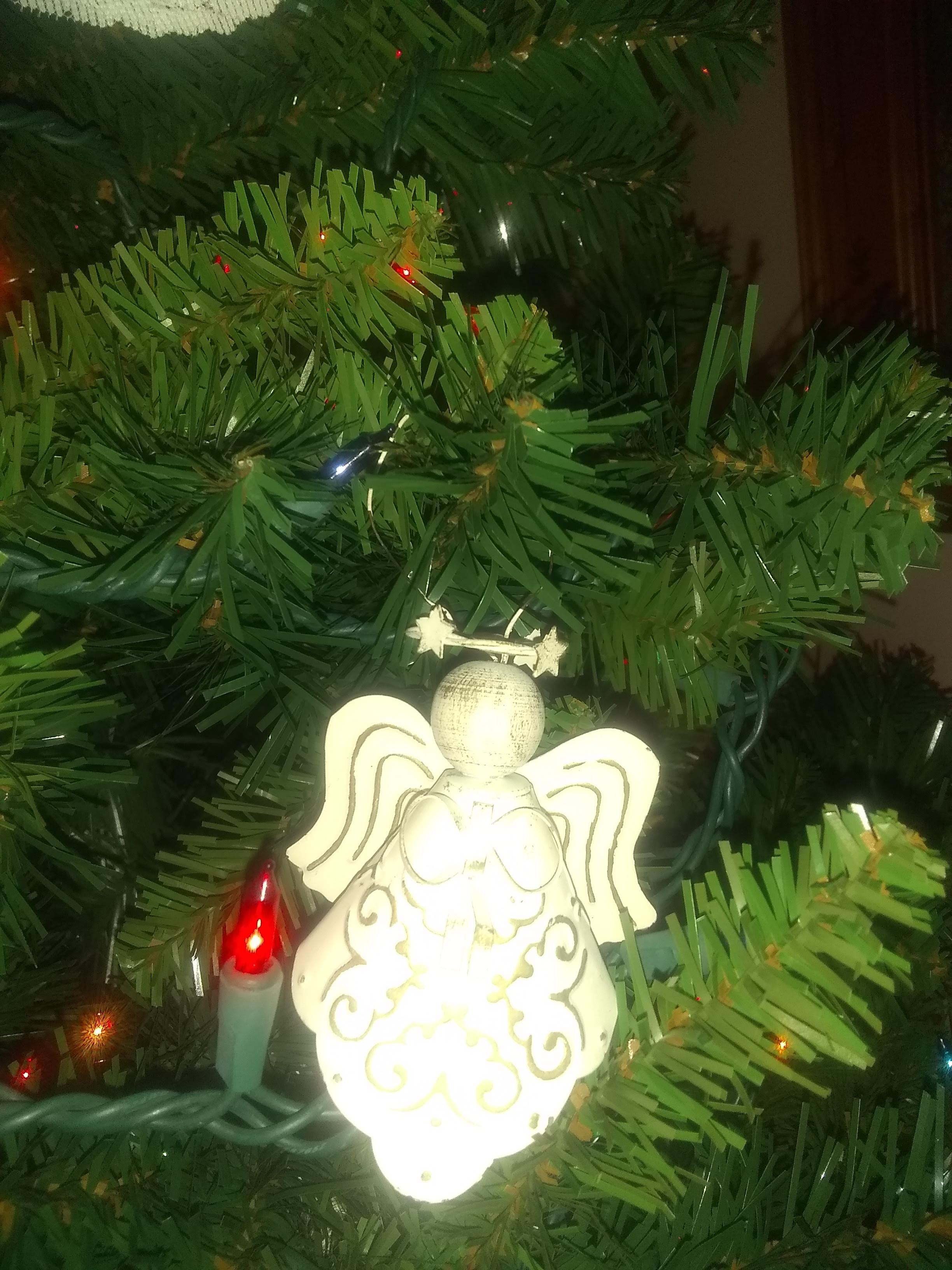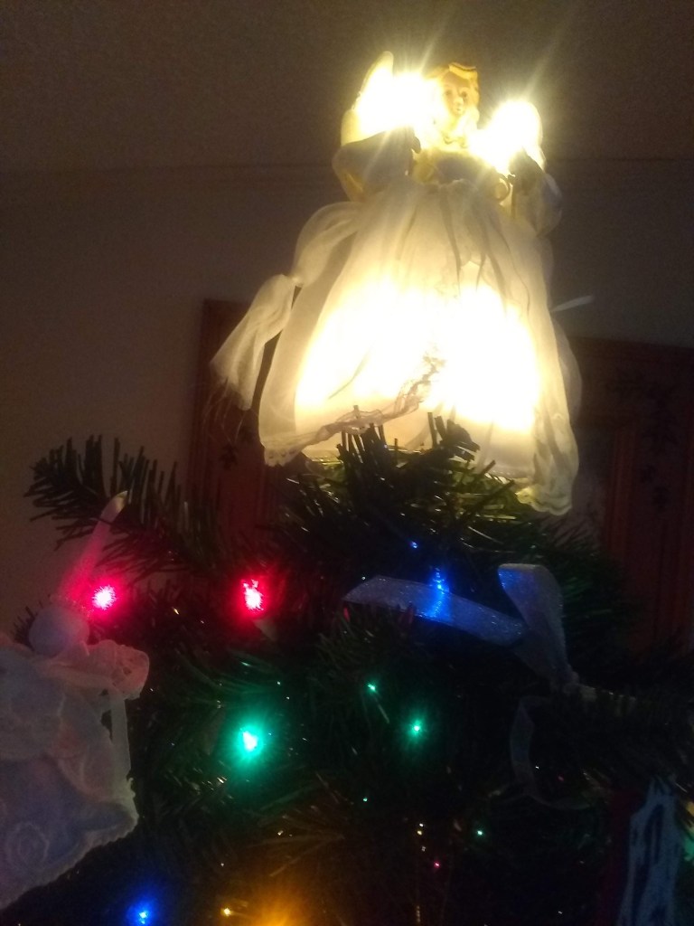 Greetings dear readers! Yes, our tree has been in storage since January first, 2016. I asked if we could put up some lights outdoors and while John was looking for lights in the garage, he found the tree in the way. He brought it in and told me to put it up one last time before we get rid of it and find a smaller one. It’s such a bright, comforting, joyous addition to our living room! You may have noticed I have a bunch of angels at the top of the tree and I’d like to share them with you. John just saw what I’m doing and asked if I’m also telling about his little blogging angel!
