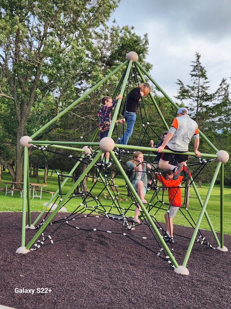I leave you with one more set of photos. That’s Grandpa with Owen & Logan on their successful fishing charter, the second bouquet of flowers for Karl [I told Jennifer Isenecker lots of colors for the flowers], Faith receiving her diploma, a good portion of our crew on the playground as part of our evening walk in the park, and Faith’s brothers Caleb & Steven at her graduation.