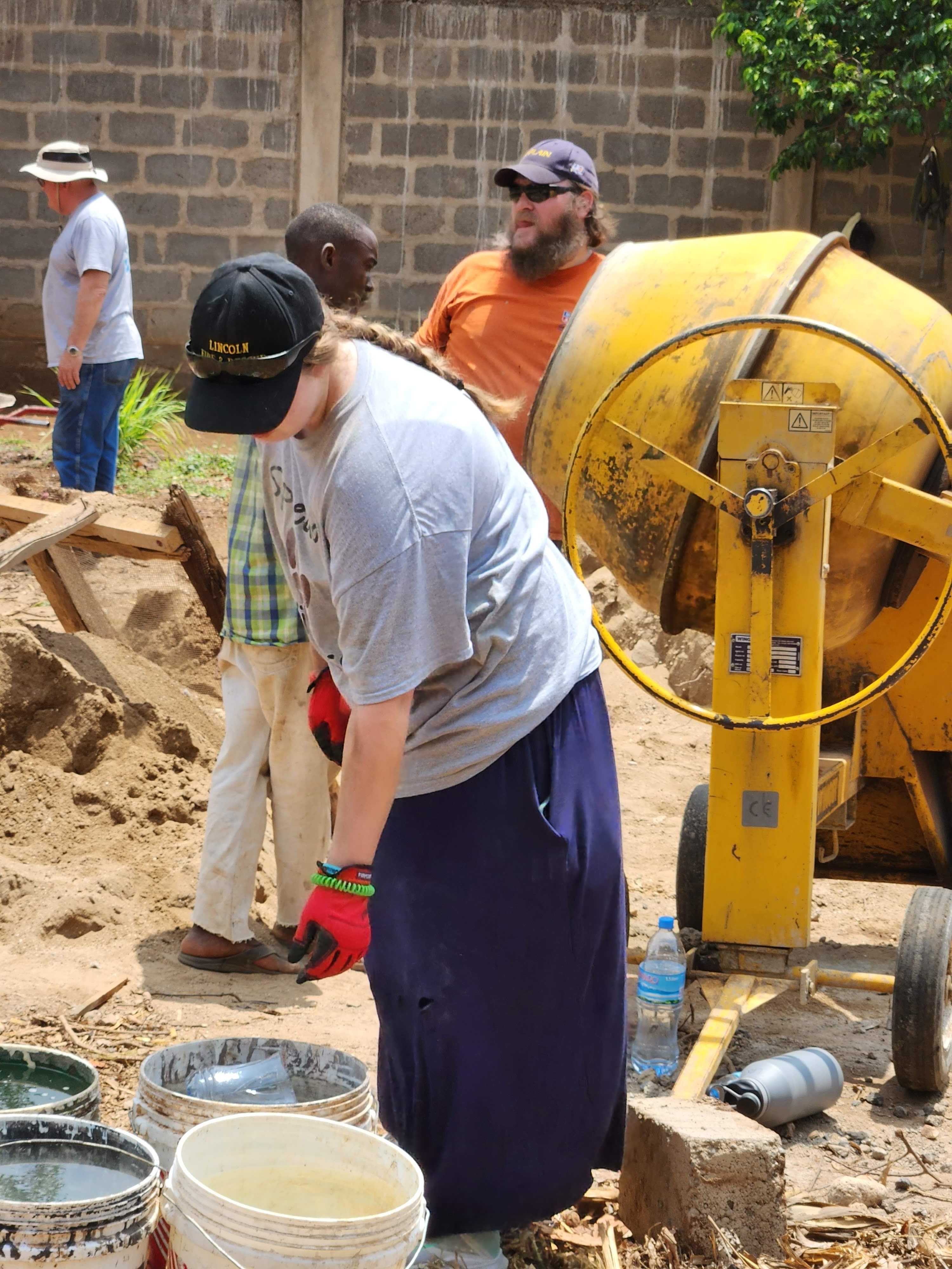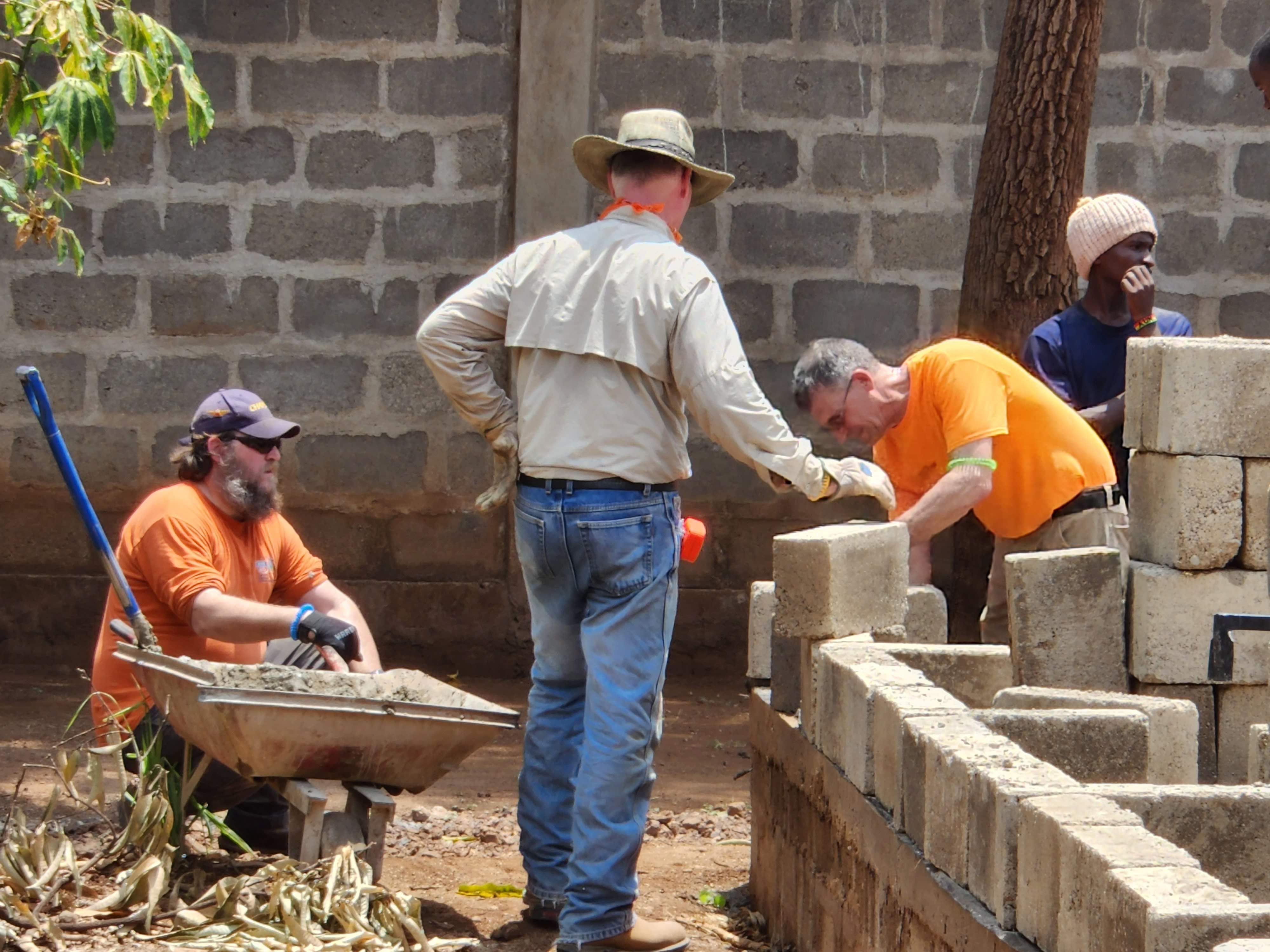 Hannah and her dad Brian are using the most important piece of equipment we had for building the walls. Praise God for providing the cement mixer and fuel! The photo to the right shows Brian, Pat, Mickey, and Edwin with the wheelbarrow used for mortar. Below that are Logan, Muhamed, John Wicks, Brendon, and Jerry (sorry, I’m not sure the name of the other Fundi). On the bottom right is Bill, our foreman, resting during lunch break. He eventually found he’s also allergic to the malaria meds. On the bottom left is where we ate lunch. Those water bottles hold 1.5 liters and the crew each had several of these a day! No one went hungry on this trip unless they chose to.