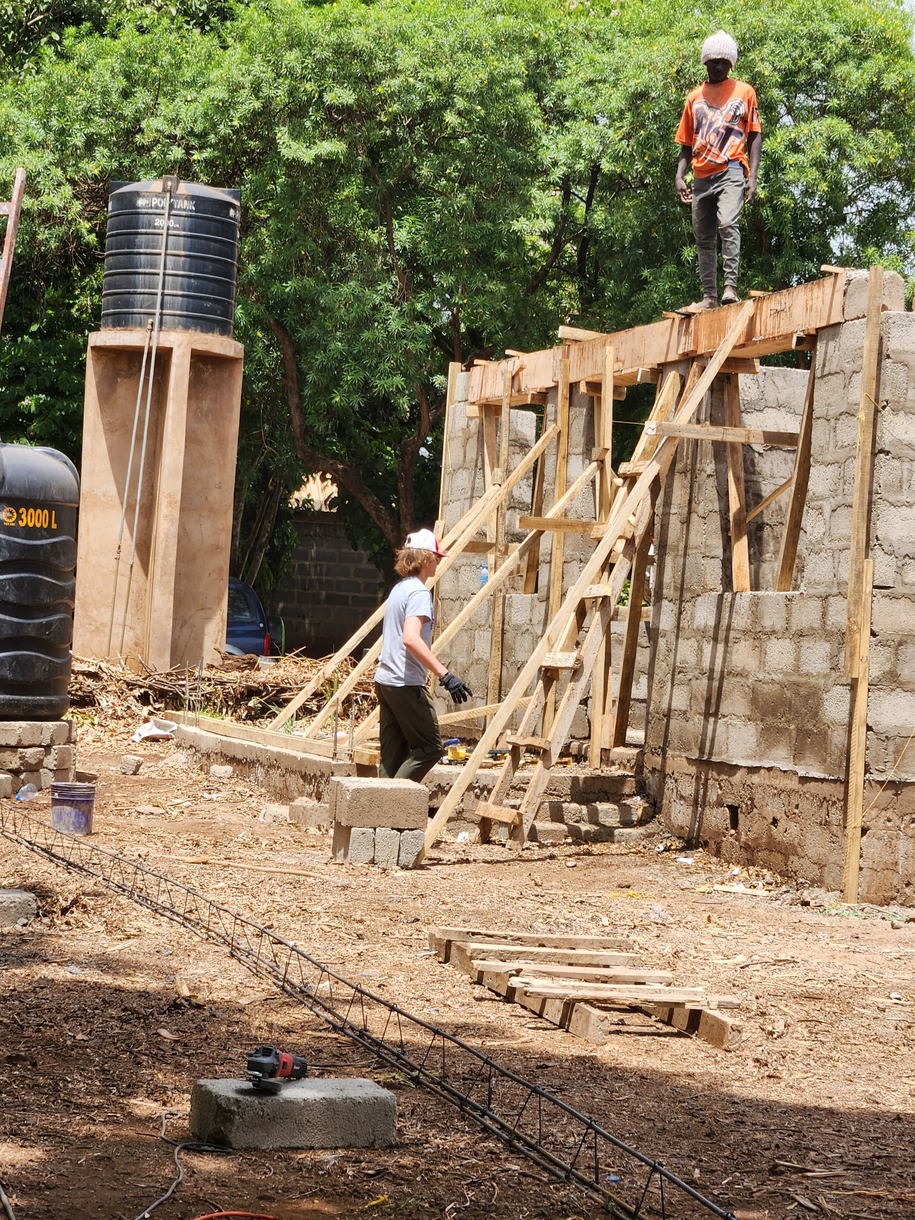 In this collage are the preschool children. A woman from the school has started a preschool in the church. The Muslims are bringing their children, the children are finding Jesus, then the parents are finding Jesus! Under that photo is the monument to Kilimanjaro mountains where their water comes from. Bottom left you see Logan helping Edwin. In the foreground is the wire they twisted together to go in the lintels. Top right is Brian and Jerry putting together the forms for the lintels over the windows and doors. Bottom right shows Daniel getting some shade & hydration while John and (I’m not sure) Muhamed or Jean Claude finishing consult. Notice the ladder leaning on the water tank? Oh, and the Fundis do not like to use the power tools.