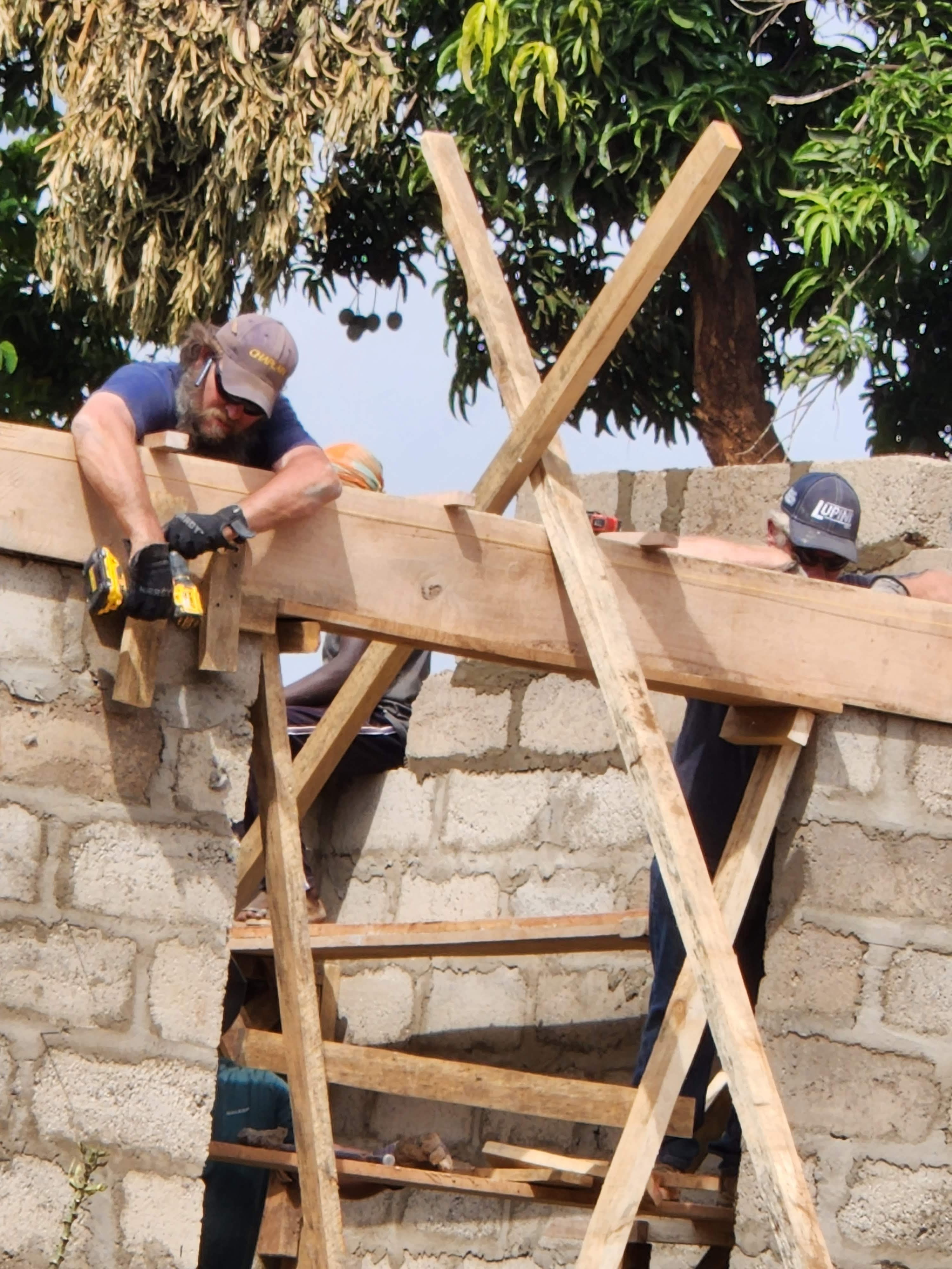 I encourage you to check out John Wicks, Wall Builders, or Marilyn Wilson Weaver on Facebook to see more photos and stories of this endeavor. The second team was able to erect the trusses we built, make the smaller trusses, and finish the roof before they left.