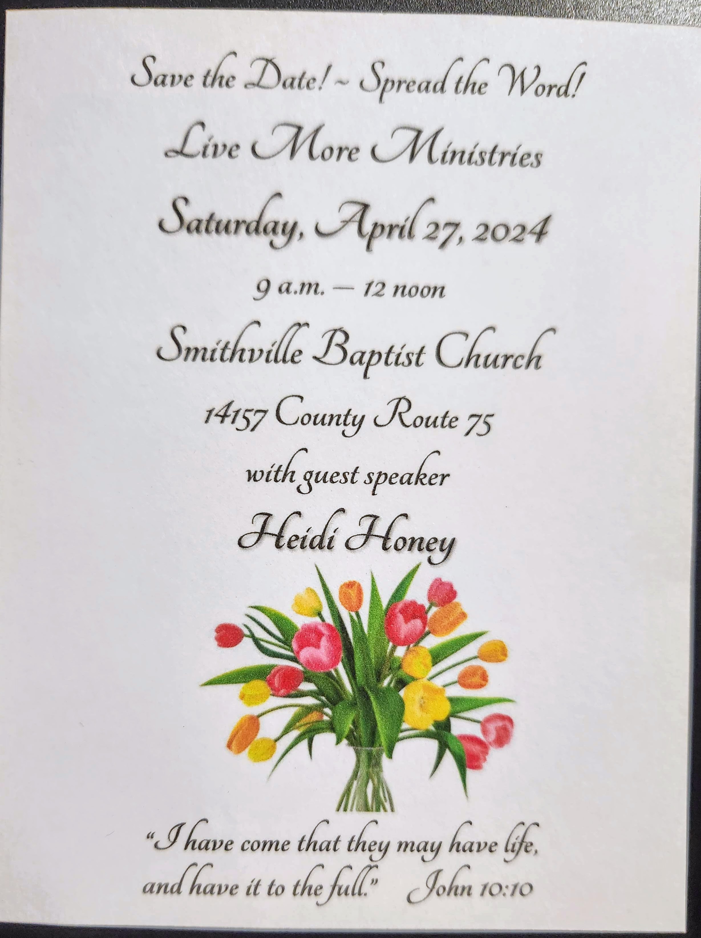 God is able to use everything for His glorious plans, even our enemies. Let us pray for those who treat us badly. Let us pray for and speak blessing over those our hearts want to condemn. As I said in my book, Musings Along Life’s Journey, If I don’t pray for them, they will be damned. The eternity of hell is so horrid, I don’t want even my worst enemy to go there! I will be speaking about my book at Smithville Baptist Church in Adams, NY in April if you are able to attend. Here is the “Save the Date” card.